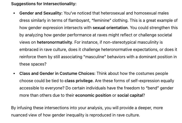 We tested ChatGPT’s feedback on a real student paper about gender in rave culture. Even after being given the course and assignment description, ChatGPT suggested adding points about class and costume choice that weren’t grounded in the readings or research focus. The feedback sounded relevant but missed the assignment entirely.
