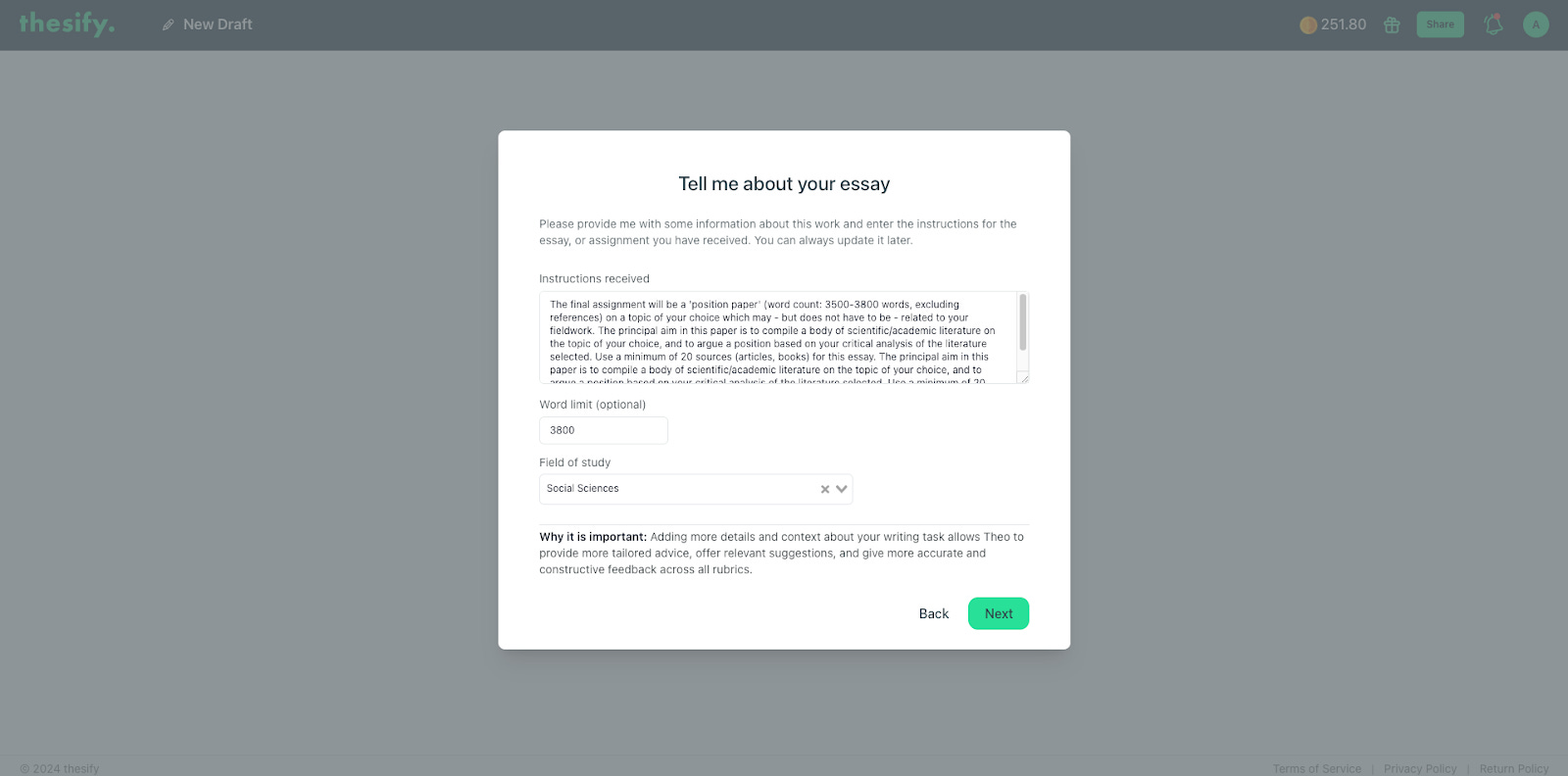 In thesify, you're prompted to enter your assignment type, word count, and field of study before feedback begins (see screenshot). This isn't cosmetic. It allows the tool to align its response with genre expectations and disciplinary conventions. Tools that skip this step are not built for academic thinking. They're built for output.