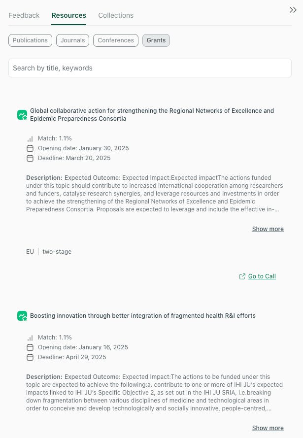Shows a match score, opening date, deadline, and short description for each call, so you can scan quickly.