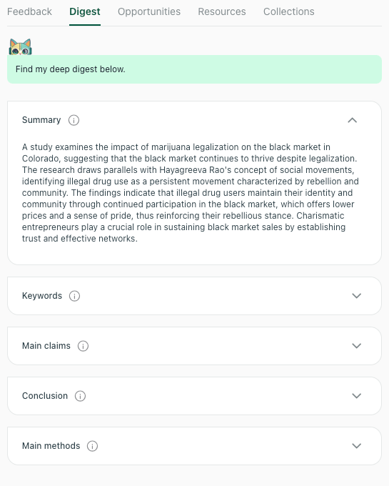 Use the Summary tool on other papers to speed up your search for future research angles. Instead of skimming abstract after abstract, use the summary to see the full argument, key claims, and conclusions at a glance.